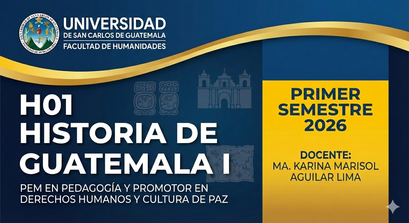 En el curso H01 Historia de Guatemala I se propicia el aprendizaje crítico de la historia de los pueblos de Mesoamérica y Guatemala, su origen y su evolución social, económica y cultural. Enfatiza en el análisis crítico de la realidad histórica y social de los pueblos. Para su mejor comprensión se vale del uso de diversas fuentes y de investigaciones etnográficas y documentales. Así mismo tiene por objeto enfocar críticamente los hechos históricos de la conquista, la colonia, hasta la independencia.
