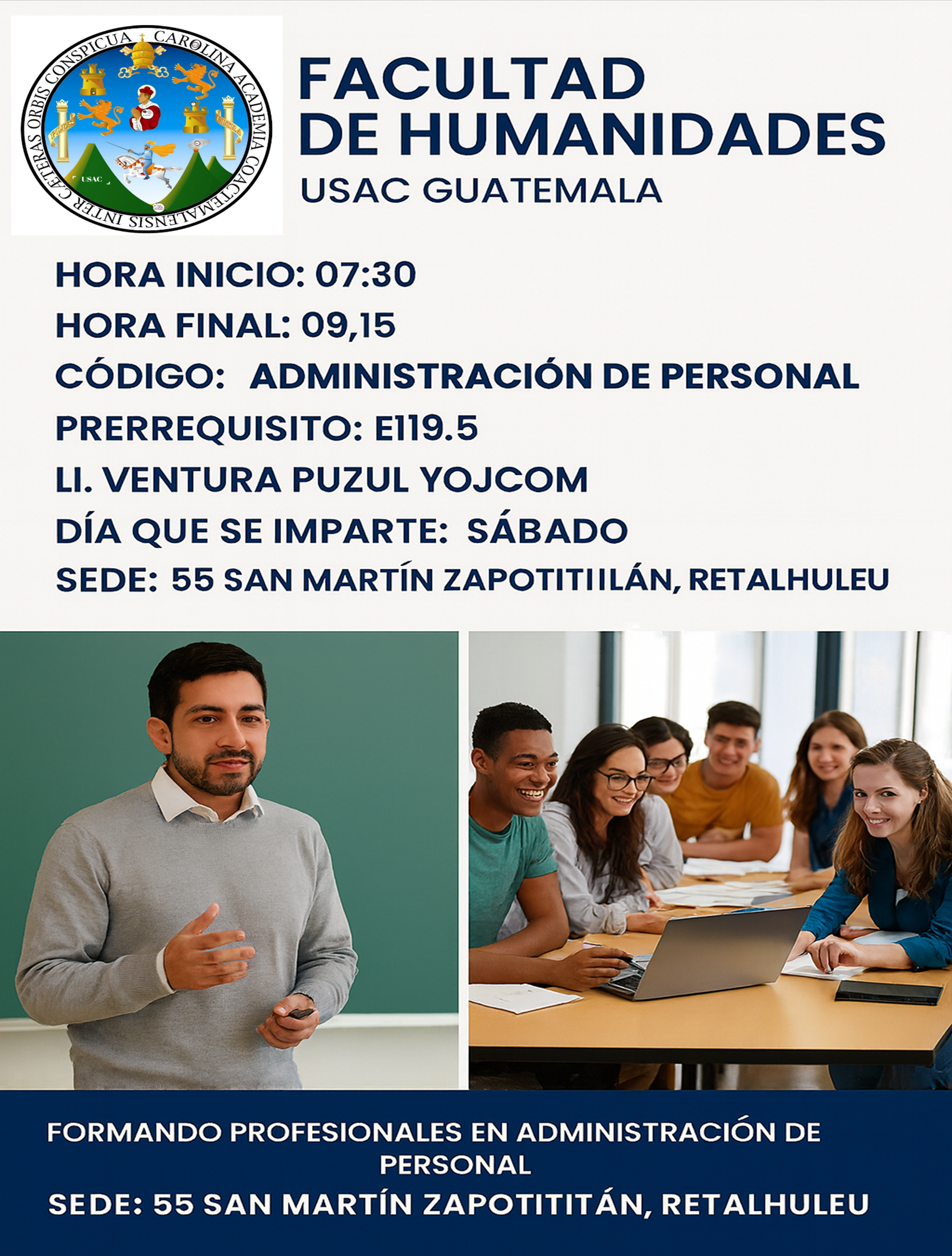 07:30 - 09:15 E120.2 Administración de Personal PRERREQUISITO E119.5 Lic Ventura Puzul Yojcom Sábado No estudiantes 11 SECCIÒN LICENCIATURA